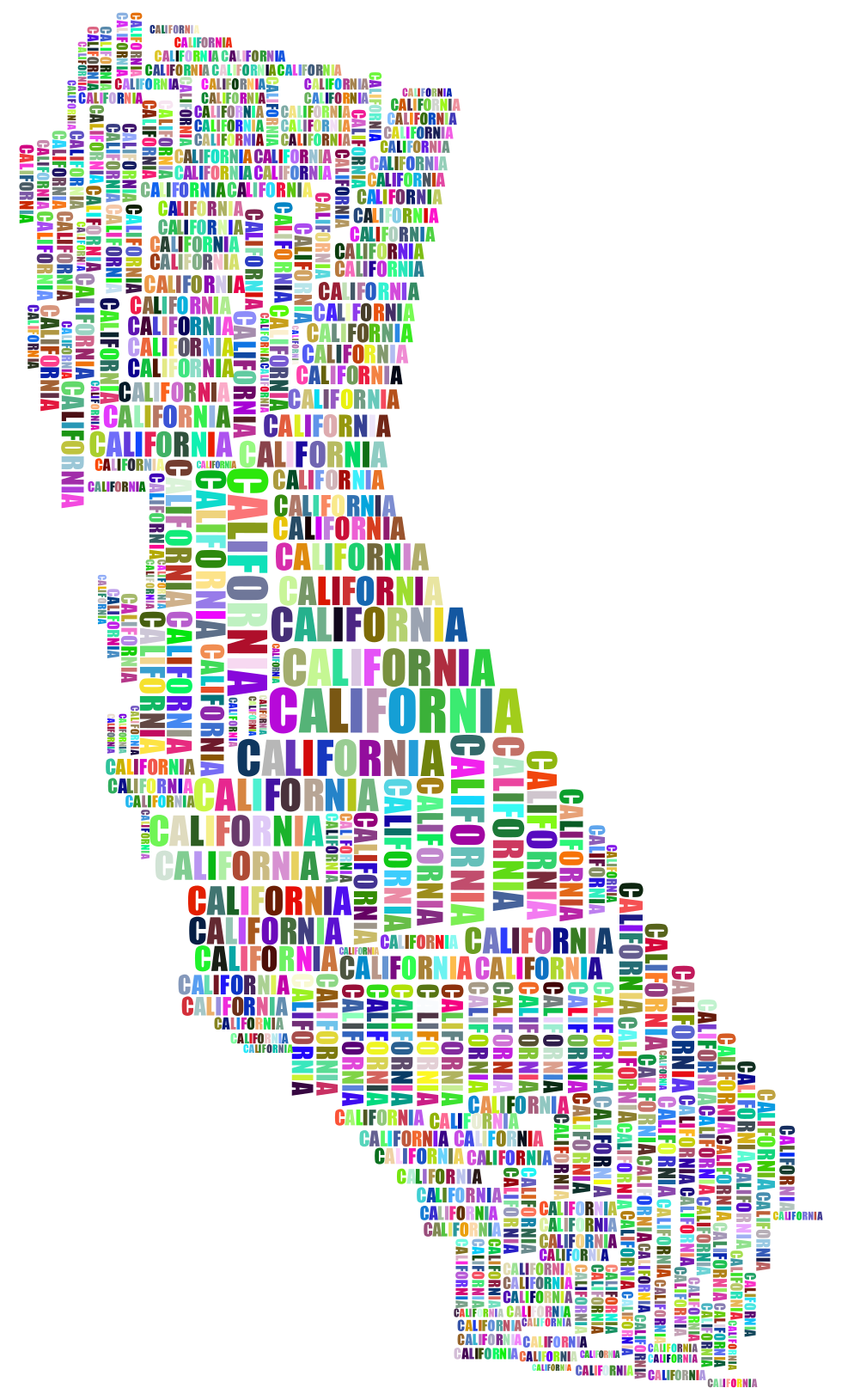 This is a creative and colorful representation of the state of California. It features a large, detailed outline of the state with various words and phrases written in different colors to create a visually appealing design. The text is arranged in such a way that it forms the shape of the state, showcasing its unique geographical features. This artistic representation of California serves as an interesting and engaging visual representation of the state's identity.