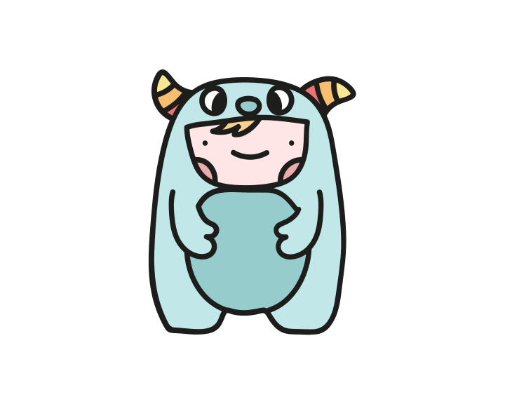 This features a hand-drawn cartoon monster with a big head and horns. It is wearing a blue outfit, giving it an adorable appearance. The monster has a smiling expression on its face, making it look friendly and approachable. Its body is positioned in the center of the image, while its arms are held up to the sides, adding a sense of motion and playfulness to the scene. Overall, this whimsical creature exudes a cheerful and inviting vibe.