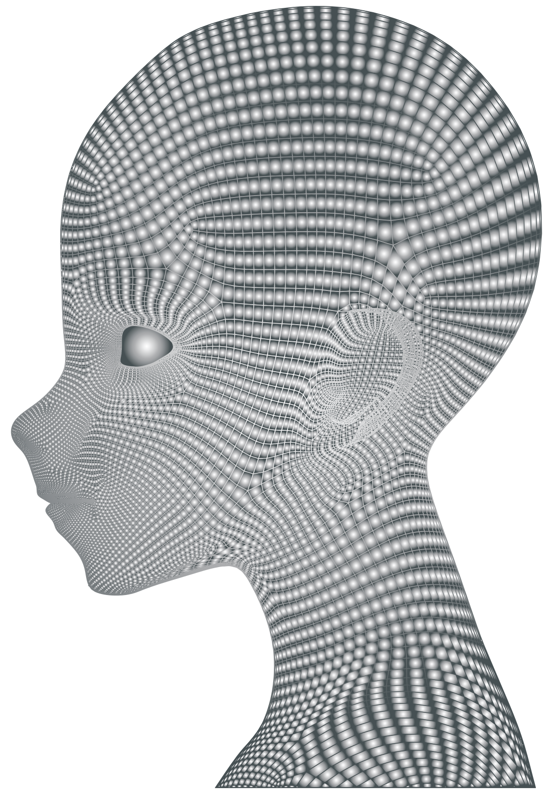 This features a close-up of a 3D model of a child's head. It is made up of gray and black lines, giving it an interesting and unique appearance. The head has small eyes, ears, and mouth, which are all clearly visible in the detailed design. This artistic representation of a human head showcases the intricate details that can be achieved through digital modeling techniques.