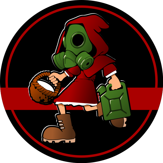 This features a cartoon character dressed in a red riding hood, wearing a green gas mask and carrying a green can of kerosene. Little Red Riding Hood is also holding a brown basket in her other hand. She stands out against the black background with a horizontal red stripe going across it. The overall design gives off a creepy vibe, making for an interesting and unique image.
