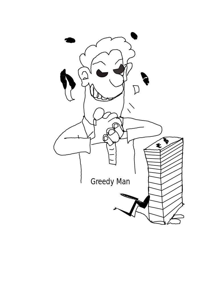 This features a cartoon drawing of a man with an evil grin on his face. He is wearing a tie and has his hands clasped together, giving the impression that he is holding money or something valuable. In front of him, there is a stack of bills, which further emphasizes his greedy nature. The cartoon character appears to be the main focus of the image, with no other objects or people visible in the scene.
