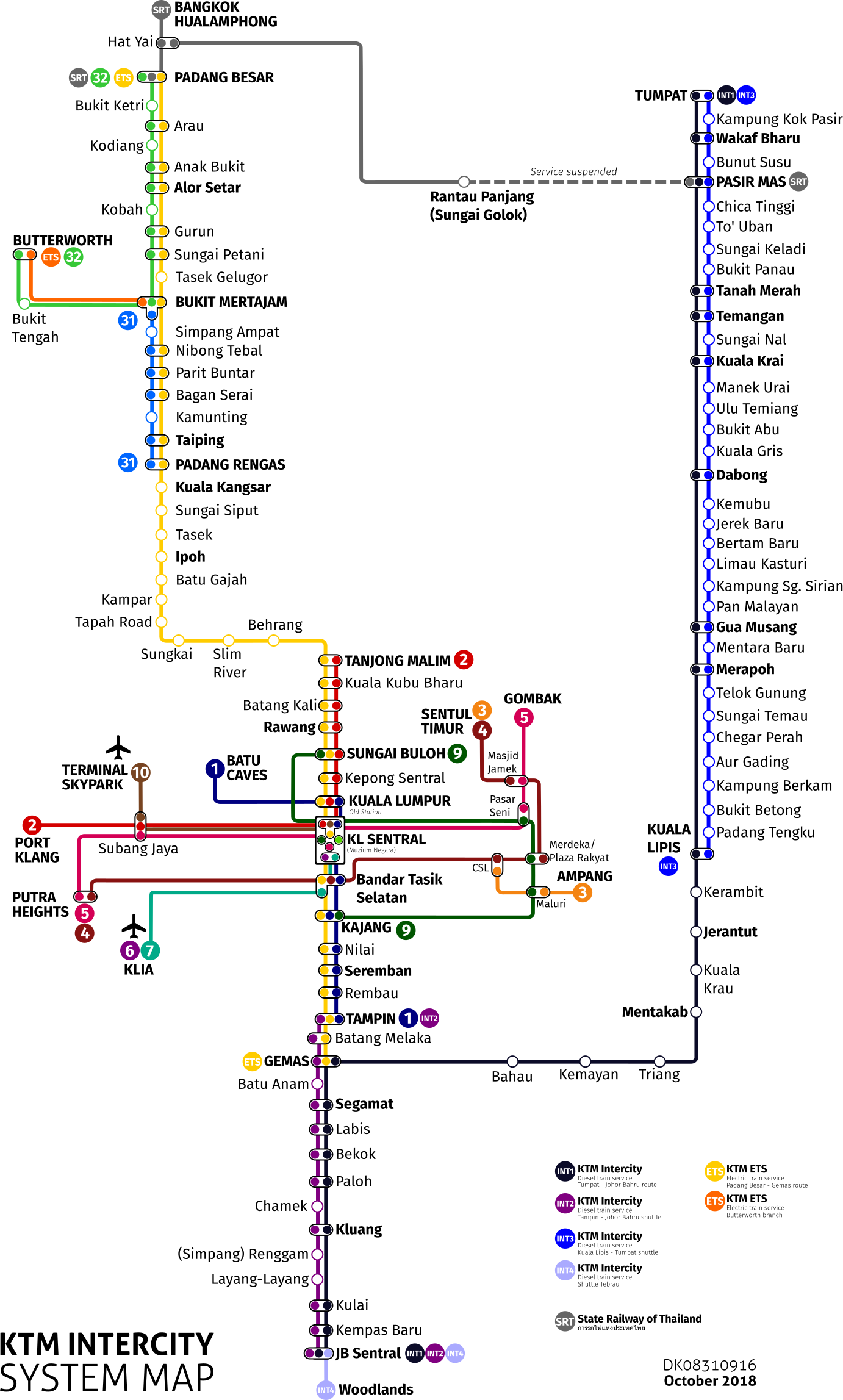 This is a map of the Malayan Railways System, which includes various train routes and destinations. The map is color-coded to indicate different types of trains or services available on each route. There are several lines connecting different cities and towns across Malaysia, with some routes running through more densely populated areas while others pass through less populated regions. The map also features a numbered key that corresponds to the train routes, making it easy for users to identify specific destinations or services. The Malayan Railways System Map is an essential tool for travelers and commuters who need to plan their journeys across Malaysia using public transportation.
