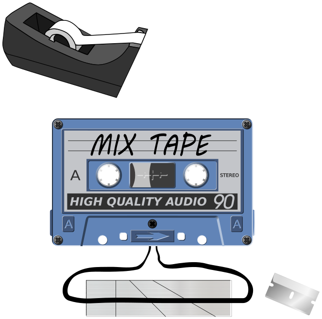 This features a blue cassette tape with the words "mix tape" written on it. It is placed next to an audio splicing block, which is used for cutting and joining tapes. A pair of scissors can also be seen in the scene, likely used for cutting the tape. The overall setting suggests a nostalgic atmosphere reminiscent of the days before digital music editing tools like Audacity became widely available.