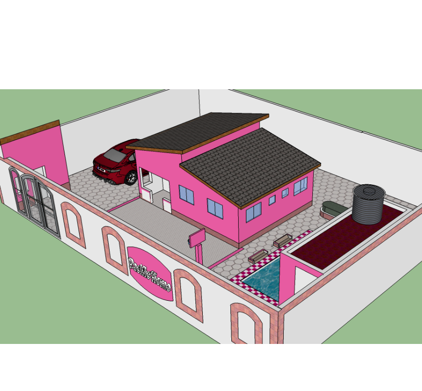 Tags: car, clipart_issue, fence, house, pink, pool