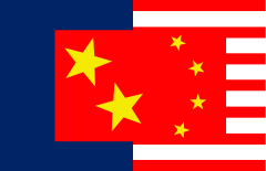 This features a flag of China, with the red and white colors prominently displayed. The flag is flying in front of an American flag, creating a striking contrast between the two nations' symbols. The Chinese flag has five stars on it, which are arranged in a triangular pattern. This combination of flags represents a blend of cultures and traditions from both countries.