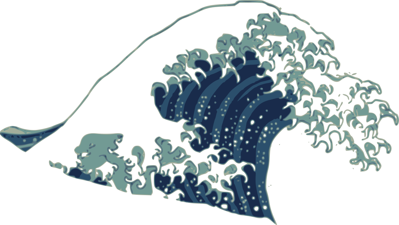 This features a large, colorful wave with a blue and green hue. It is reminiscent of the famous "The Great Wave Off Kanagawa" painting. The wave has a few small ripples in it, adding to its dynamic appearance. The wave's shape extends from the left side of the image almost all the way to the right edge. This illustration could be used as a vector or pattern for various purposes such as designing clothing, accessories, or other items inspired by nature and ocean waves.