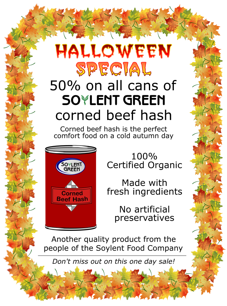 This is a poster advertising a special Halloween edition of Seylent Green, which is a soy-based meat substitute. The poster features a red can with the words "Seylent Green" written on it and an illustration of a beef hash. The poster also includes a discount offer for 50% off all cans of Seylent Green Soybean Green Corned Beef Hash. The advertisement is set against a backdrop of autumn leaves, giving the impression that this product is perfect for cold autumn days.