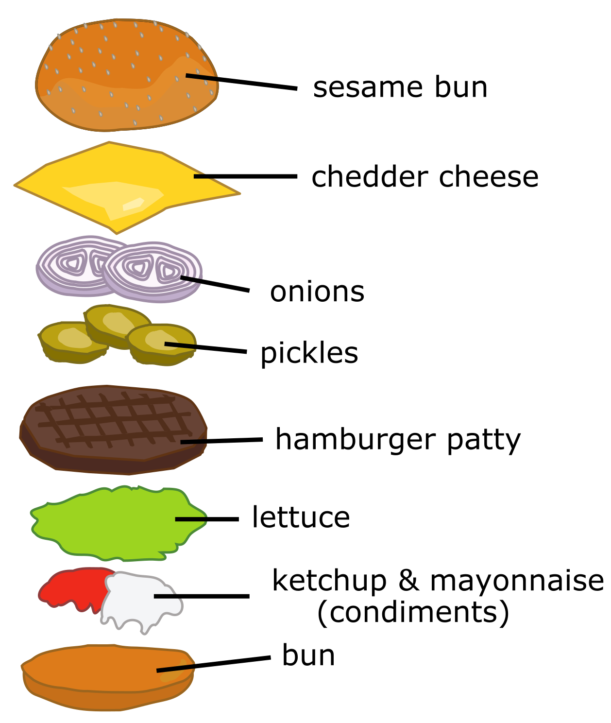 Tags: bbq, cartoon, chart, cheese burger, diagram, drawing, eat, education, efl, english, esl, fast food, hamburger, ingredients, junk food, label, learning, part, piece, poster, school, teaching, text