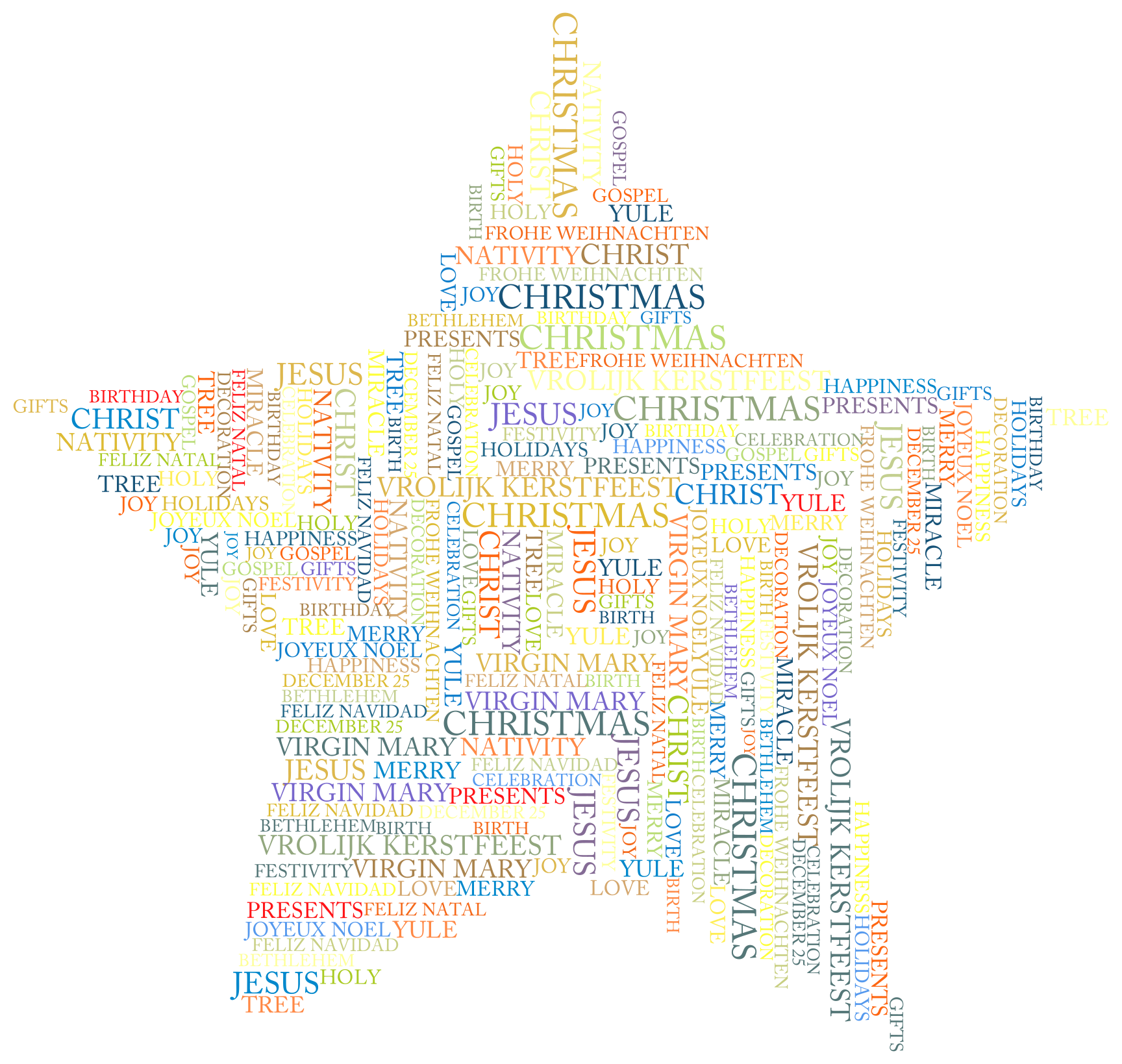 This features a colorful word cloud made up of various Christmas-related words. These words are arranged in such a way that they form the shape of a star, with each word being connected to its neighboring words. The star is filled with different colors, making it visually appealing and festive. The words themselves include phrases like "Merry Christmas," "Jesus," "Gifts," "Santa Claus," "Holiday," and many others that are commonly associated with the holiday season. Overall, this word cloud creates a fun and engaging visual representation of popular Christmas-related terms.