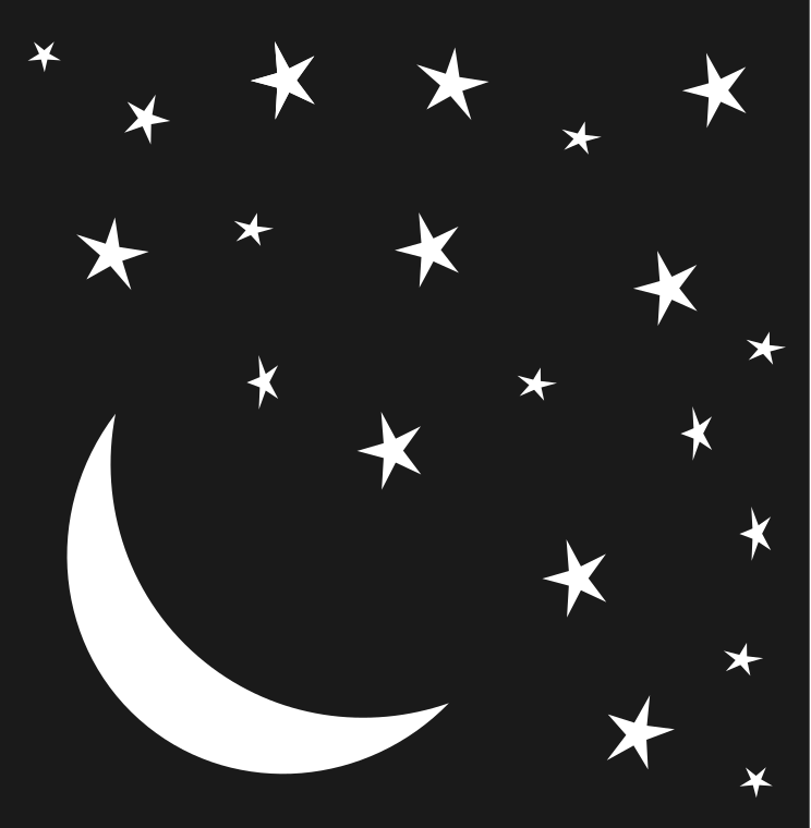 This features a night sky filled with stars and the moon. The moon is prominently displayed in the center of the scene, surrounded by numerous stars scattered throughout the sky. The stars vary in size and position, creating a sense of depth and movement within the black background. This serene and peaceful image captures the beauty of the nighttime sky and the celestial bodies that illuminate it.