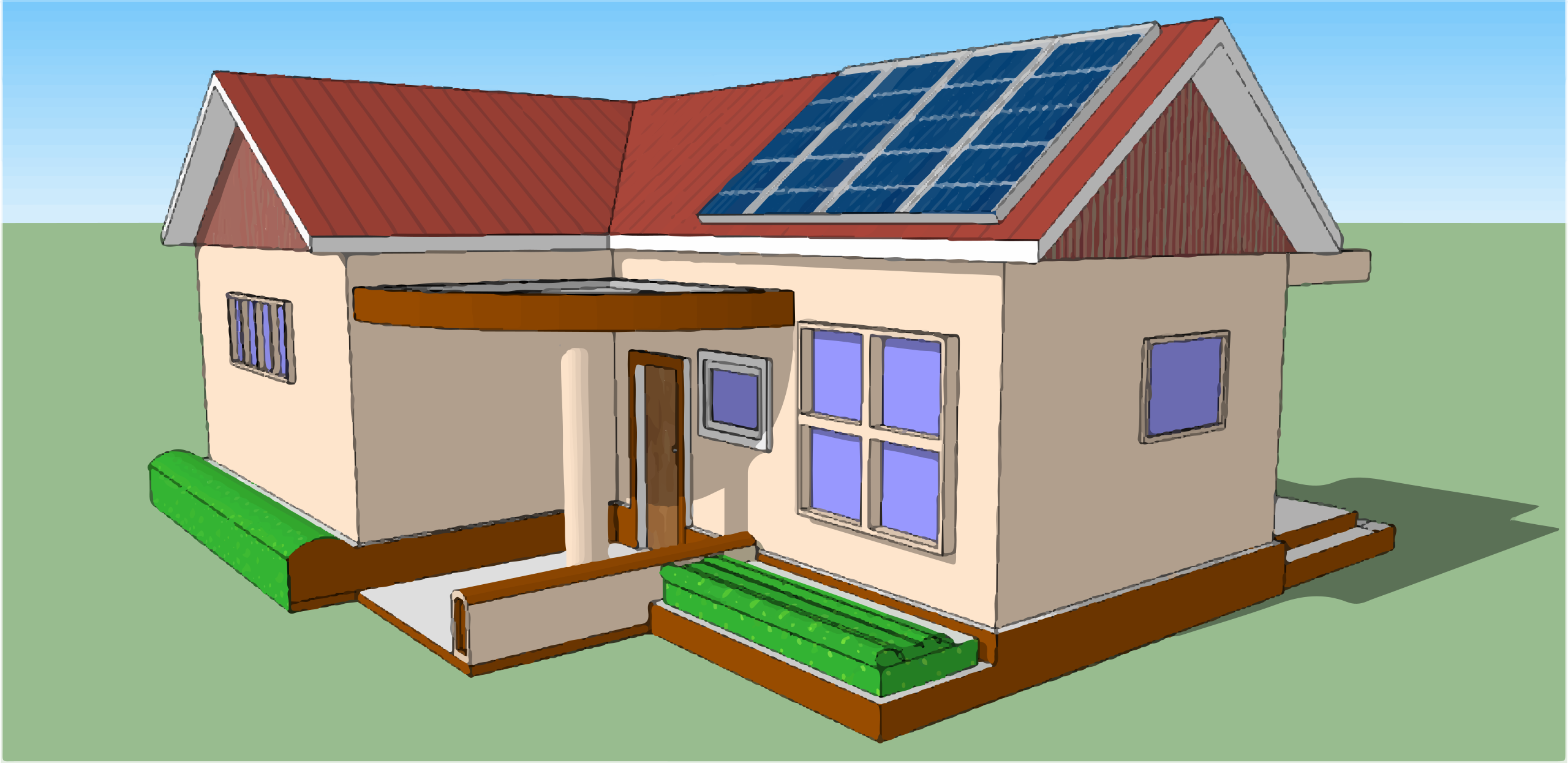 This features a three-dimensional drawing of a house with a red roof and white walls. It has a large window on the front, giving it an open and inviting appearance. A small porch is situated in front of the house, adding to its charm. The house also has a solar panel on top, indicating that it may be designed for energy efficiency or sustainability. The drawing appears to be a detailed and realistic representation of a home, showcasing both its exterior and interior design elements.
