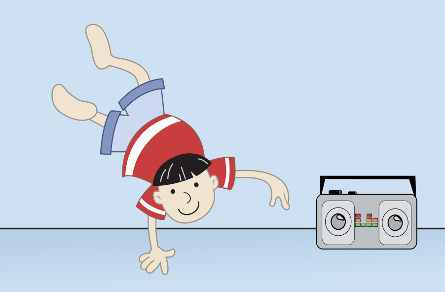 This features a cartoon character, possibly a boy or a girl, in the middle of an action scene. They are upside down and appear to be falling off a wall while holding onto a radio. The character is wearing red shorts and has a smiling expression on their face. The radio is positioned close to the bottom right corner of the image, with the cartoon figure's hand gripping it firmly. This scene captures an exciting moment in the character's adventure as they interact with the radio.