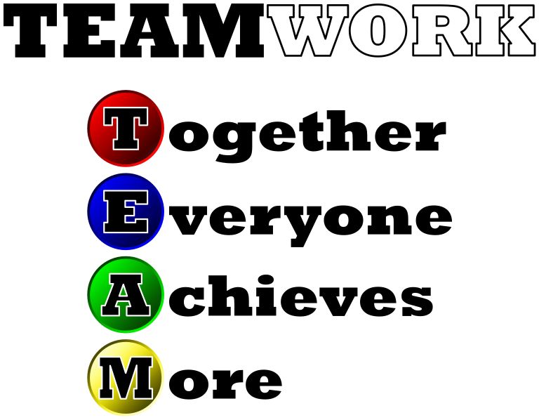 This features a sign that says "Teamwork" in large letters, with each letter being colored differently. The colors used are red, blue, green, yellow, and black. These colors create an eye-catching visual effect, making the sign stand out. The sign is likely meant to convey the importance of teamwork and collaboration in achieving common goals or working together towards a shared objective.