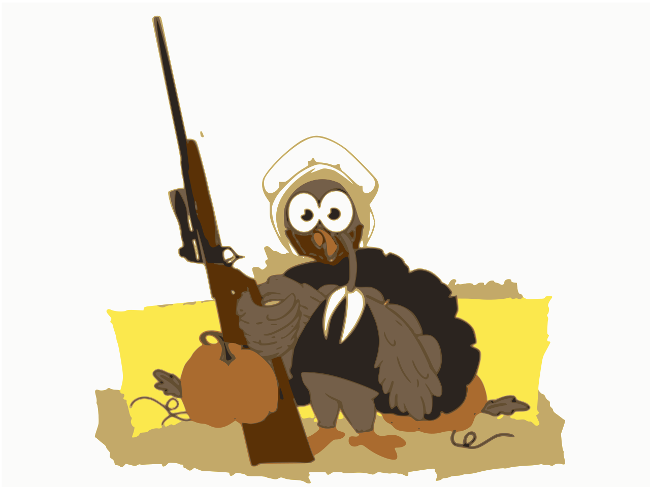 This features a turkey with a gun in its mouth, sitting on the ground. It appears to be dressed up for hunting humans, as it is holding a rifle and has a pumpkin nearby. The turkey's facial expression seems to be playful or humorous, adding an element of fun to the scene. This creative image could be used in various contexts, such as advertising, holiday decorations, or even as part of a Thanksgiving-themed party.