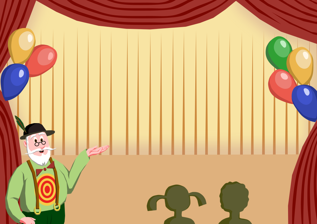 This features a man standing on stage in front of a curtain, pointing towards the audience. He appears to be an old man with a hat and is wearing a green vest. There are two children watching him intently from the audience, one closer to the left side of the stage and the other nearer to the right. The scene also includes several balloons placed on the sides of the stage, adding a festive touch to the performance.