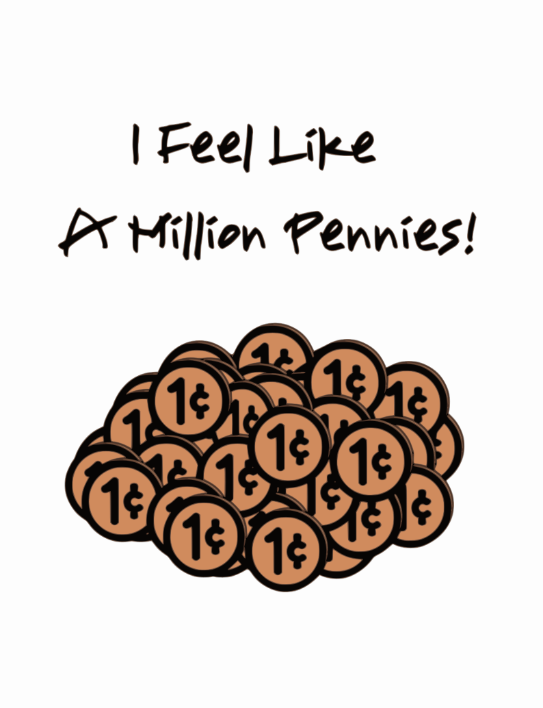 This features a large pile of one cent coins, with the words "I feel like a million pennies!" written above them. The coins are arranged in various stacks and piles, creating an eye-catching display. The overall effect is that of a comical or humorous statement about the abundance of these small change coins.