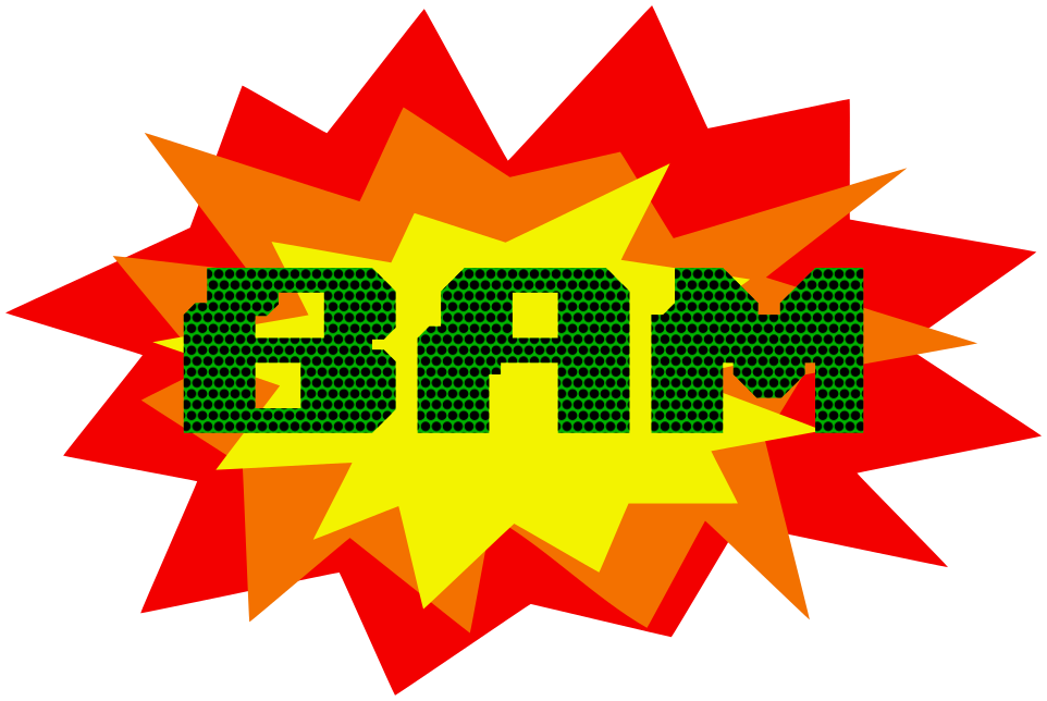 This features a brightly colored explosion with three distinct colors, red, yellow and orange. In the center of this vibrant display is the word "BAM" written in green. This colorful explosion gives off an energetic and lively atmosphere.