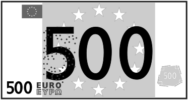 This features a 500 euro bill with stars and the word "Euro" written on it. The bill is in black and white, giving it an old-fashioned appearance. There are several stars scattered across the bill, adding to its visual appeal. Additionally, there are two other bills visible in the image, one located towards the top left corner and another at the bottom right corner of the main bill. These smaller bills appear to be part of a larger collection or display.