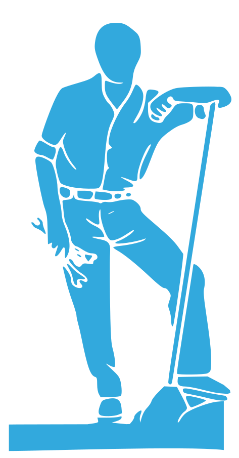 This features a blue silhouette of a man holding a shovel. He is standing on one leg, giving the impression that he is posing for a picture or statue. The man's posture and the fact that he is holding a shovel suggest that he might be a worker in some capacity. The silhouette itself appears to be a stylized representation of the man, with his figure being outlined in blue against a lighter background.