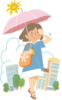 This features a woman walking down the street while holding an umbrella. She is wearing a blue dress and appears to be carrying a handbag. In addition, she has a cell phone in her hand. The scene takes place on a sunny day with buildings visible in the background. There are also two other people present in the image, one located near the left edge of the frame and another person further back on the right side.
