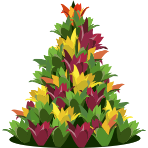 This features a colorful and vibrant tropical Christmas tree made from various shades of orange, yellow, green, and magenta flowers. The tree is adorned with numerous leaves that add to the lush appearance of the plant. The flowers are arranged in such a way that they create an eye-catching display, making it a festive centerpiece for any occasion. The combination of different colored flowers creates a visually appealing and unique design that stands out from traditional Christmas trees.