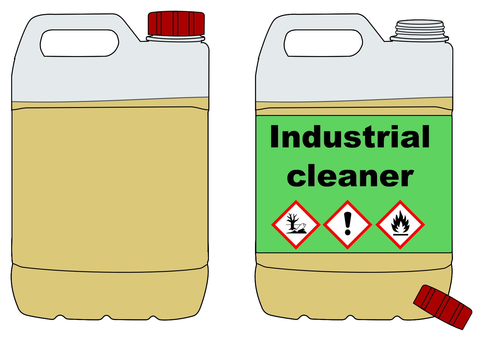 This features two bottles of industrial cleaner, one on the left and another on the right. Both bottles are yellow in color and have a green label with white text that reads "Industrial Cleaner." They both have red caps to secure their contents. One of the bottles has a warning symbol next to it, indicating potential hazards associated with the product. The bottles are placed on a surface, possibly for display or storage purposes.