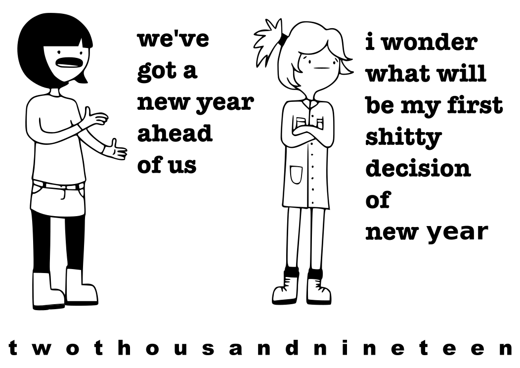 This features a comic strip style illustration of two girls, one on the left and another on the right. They are both wearing casual outfits and appear to be engaged in conversation with each other. The girl on the left is dressed in black, while the girl on the right is dressed in white. Both girls have their mouths open as they speak, giving a sense of excitement or anticipation for the new year ahead. The image also includes text that reads "We've got a new year ahead" and "I wonder what will be my first decision of New Year." This suggests that the two girls are discussing their plans and goals for the upcoming year, possibly sharing their thoughts on how they want to spend their time or make important decisions. The overall atmosphere of the image is light-hearted and fun, with a touch of humor as the girls express their excitement about the new year ahead.