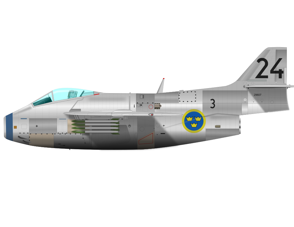 This features a silver and blue fighter jet, likely of Swedish origin. It is an illustration of the J 29 aircraft, which has a distinctive design with its wings positioned at an angle. The plane appears to be in flight, as it soars through the air against a white background. The illustration captures the sleek and powerful nature of this fighter jet, showcasing its aerodynamic capabilities and advanced technology.