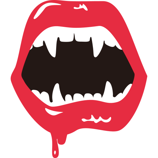 This features a red mouth with fangs, giving it an evil and menacing appearance. The mouth is wearing red lipstick, adding to its vampire-like look. There are several teeth visible in the mouth, some of which appear to be broken or chipped. A blood drop can also be seen dripping from the side of the mouth, further enhancing the scary and gory theme of the image.