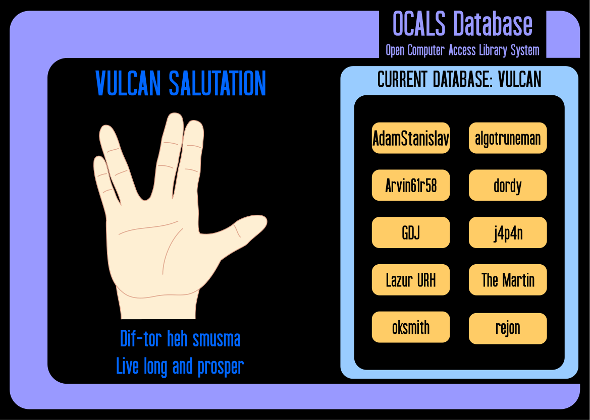 This features a computer screen displaying the Vulcan Salute, which is a hand gesture commonly associated with the Star Trek franchise. The salute is depicted in various colors and sizes on the screen, making it visually appealing. The screen also displays a list of names, likely representing users or characters from the Star Trek universe. This unique combination of elements creates an interesting visual experience for viewers who are fans of the popular franchise.
