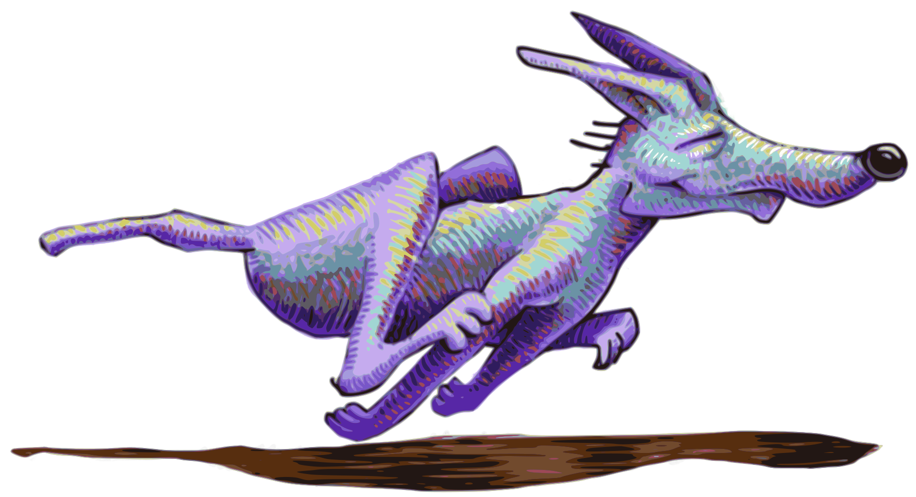This features a purple and blue dog running at full speed. It appears to be mid-run, as the dog has all four legs off the ground, showcasing its agility and energy. The dog's body is positioned in such a way that it seems to be flying through the air, giving an impression of motion and action. This illustration captures the excitement and energy associated with running, making it an engaging visual for viewers.
