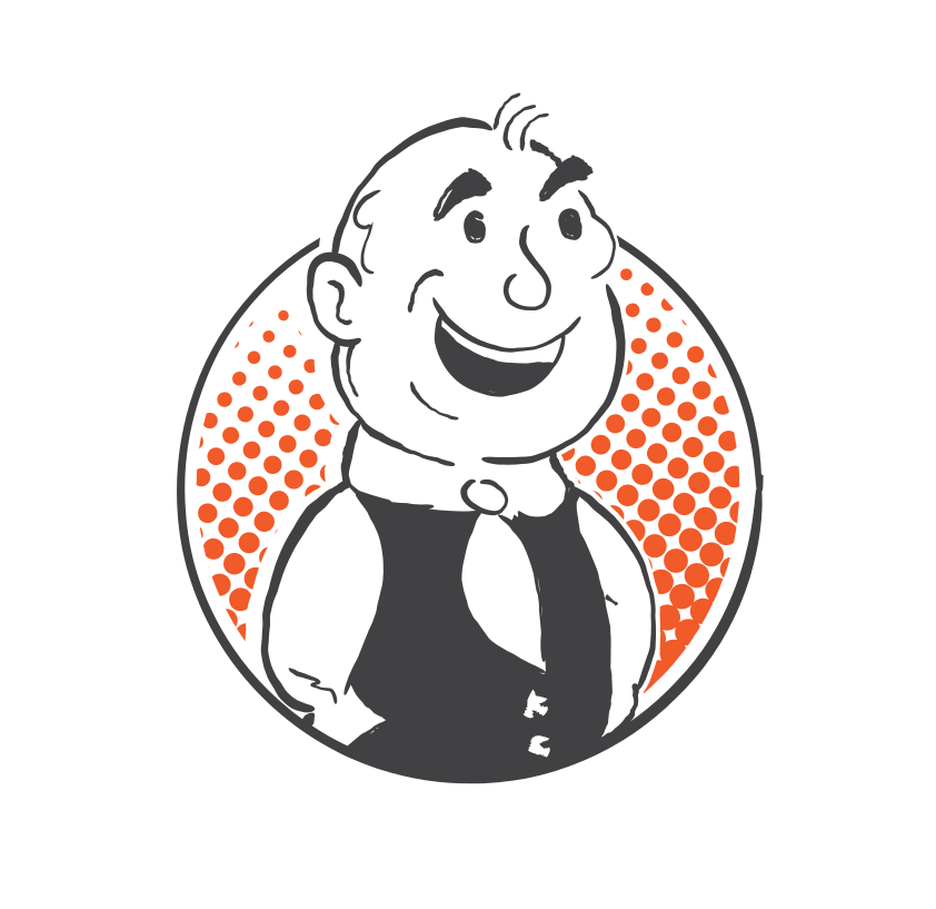 This features a cartoon drawing of an older man wearing a black vest and tie. He is smiling, giving the impression that he is happy or content. The man's attire includes a white shirt underneath his vest, which adds to the overall polished appearance. The drawing itself has a retro style, with a vintage feel that evokes nostalgia for an earlier time period.