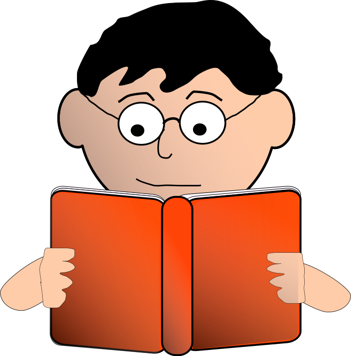 This features a cartoon illustration of a man wearing glasses, holding an open book in his hands. He appears to be reading the book with great interest and focus. The book is positioned towards the left side of the scene, while the man's face occupies most of the right side of the image. His glasses are clearly visible on top of his head as he reads intently. This illustration captures a moment of intellectual curiosity and engagement with the content within the book.