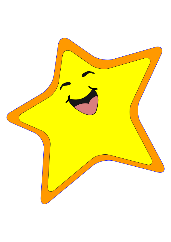 This features a yellow star with an orange outline, which is smiling and appears to be happy. It has a playful and cheerful expression, making it an appealing and fun design element. The star's bright color and the addition of the orange outline give it a lively and vibrant appearance that can easily catch one's attention. This type of design could be used in various contexts such as children's toys, wall decorations, or even clothing items, where its cheerful nature would add a touch of joy and positivity.