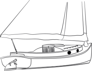 This features a sailboat with its cover open, showcasing the interior. The boat is white and has a black sail attached to it. There are two sails visible in the scene, one larger and covering most of the boat, and another smaller one located towards the right side. The boat's interior appears to be empty, with no people or objects inside. A small window can be seen on the left side of the boat, providing a view of the outside environment. The overall atmosphere suggests that this sailboat is ready for use and waiting for its next adventure on the water.