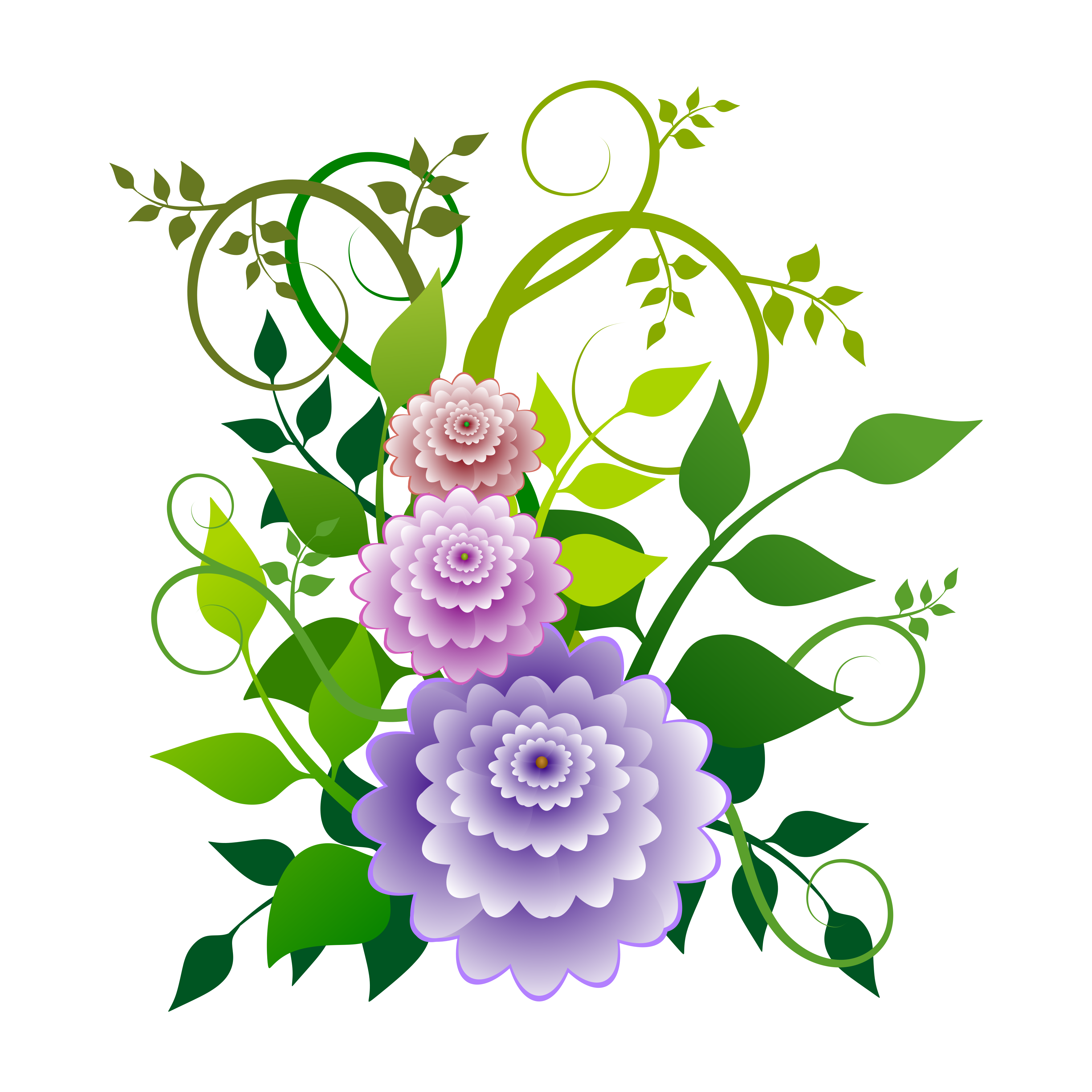 This features a beautiful arrangement of three purple flowers, each with a green leaf surrounding them. These flowers are placed in the center of an intricate design that includes leaves and swirls. The overall composition creates a sense of harmony and balance between the flowers and their surroundings. The colors of the flowers and the leaves complement each other, making this arrangement visually appealing and pleasing to the eye.