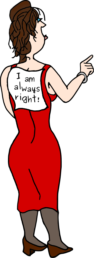 This features a woman wearing a red dress, standing with her finger pointed upwards. She has a note on the back of her dress that reads "I am always right!" Her outfit and pose suggest she is confident in her beliefs and wants to make sure others know it. The scene appears to be a comical or humorous representation of the woman's attitude, possibly meant for entertainment or as a lighthearted commentary on the subject matter.