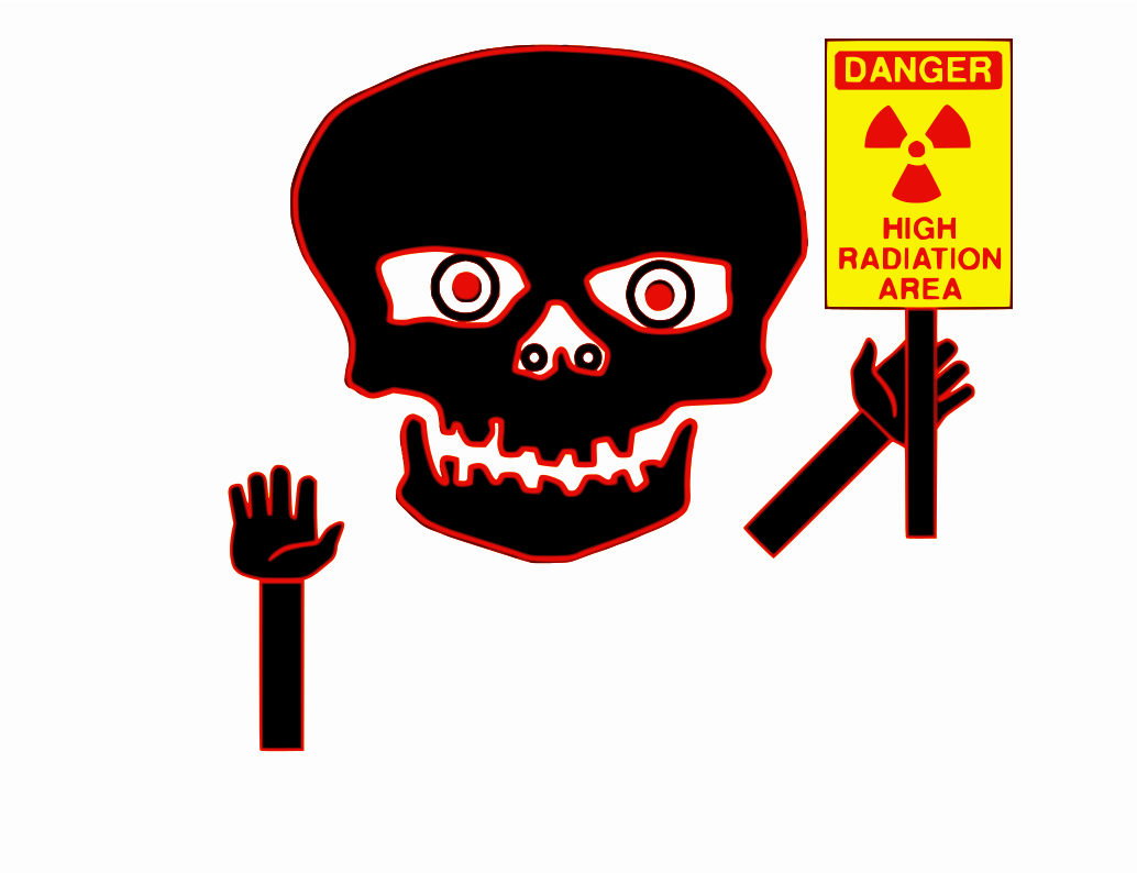 This features a skull with a radiation sign, holding it up in the air. The skull is wearing a t-shirt design and has a red background. It appears to be an artistic representation of a high radiation area or a warning about potential dangers related to radiation. The skull's facial features are distinctive, with its eyes being particularly noticeable. Overall, the image conveys a sense of caution and awareness regarding radiation hazards.
