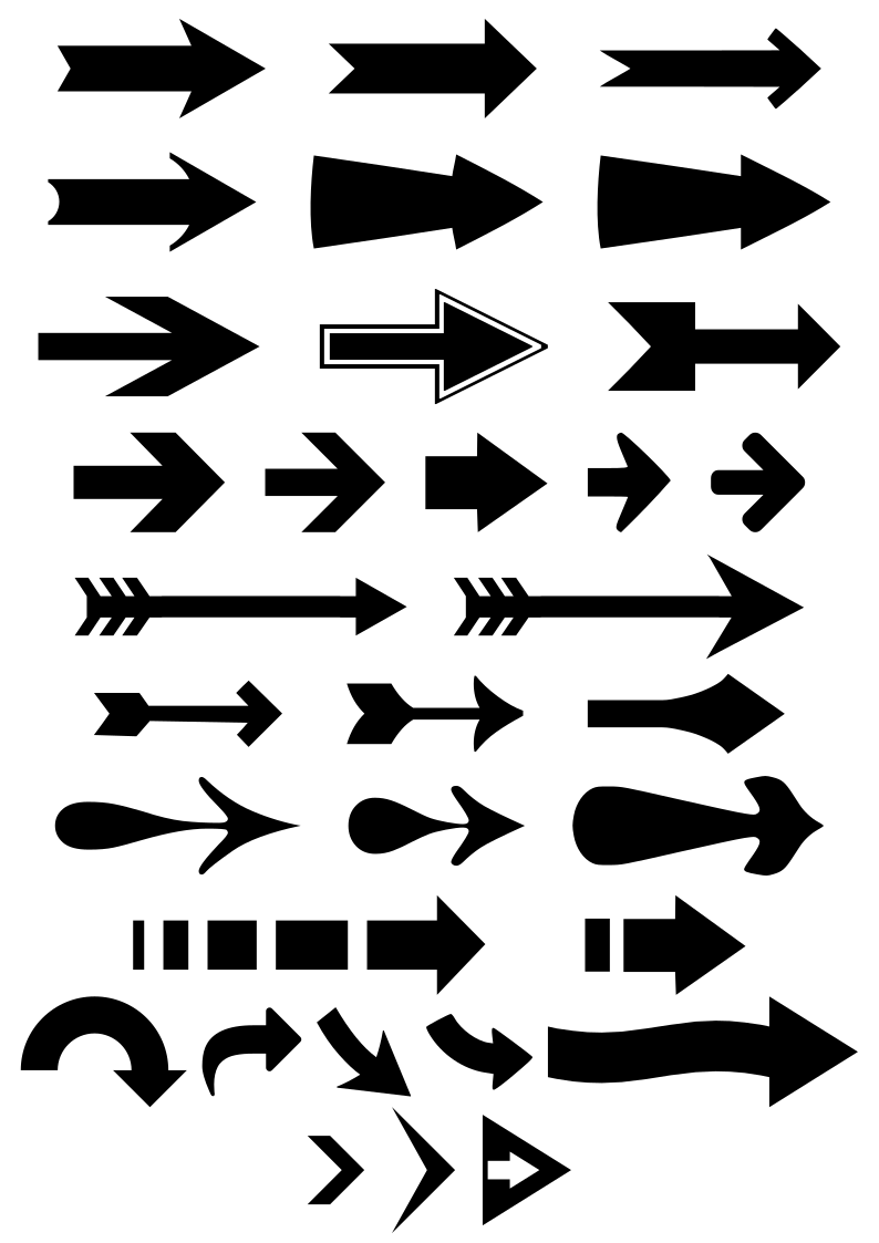 This features a collection of various arrow icons, all pointing to the right. These arrows come in different shapes and sizes, creating an assortment of designs for users to choose from. They are all black in color, making them easily distinguishable against their background. This collection of arrows can be used for a variety of purposes, such as navigation or designing user interfaces.