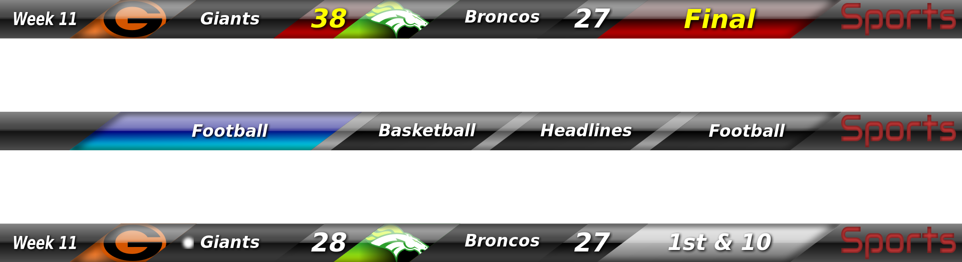This displays two screens with the same sports game being played. On one screen, the score is 27 to 19 in favor of the Broncos. The other screen shows a different score, which is 38 to 20 for the Giants. Both screens have headlines and advertisements at the bottom, including "Sports" on both sides. The game appears to be an exciting match between these two teams.