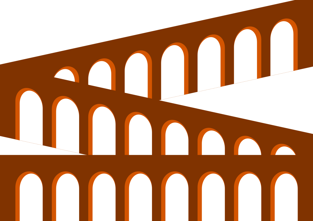 This features a unique design of an arched bridge with multiple arches. The bridge is made up of several archways, each one slightly different in size and shape. These arches are arranged in a way that creates a visually interesting pattern. The bridge appears to be constructed from red bricks, giving it a warm and earthy tone. Overall, the image showcases an artistic representation of a bridge with a distinctive architectural style.