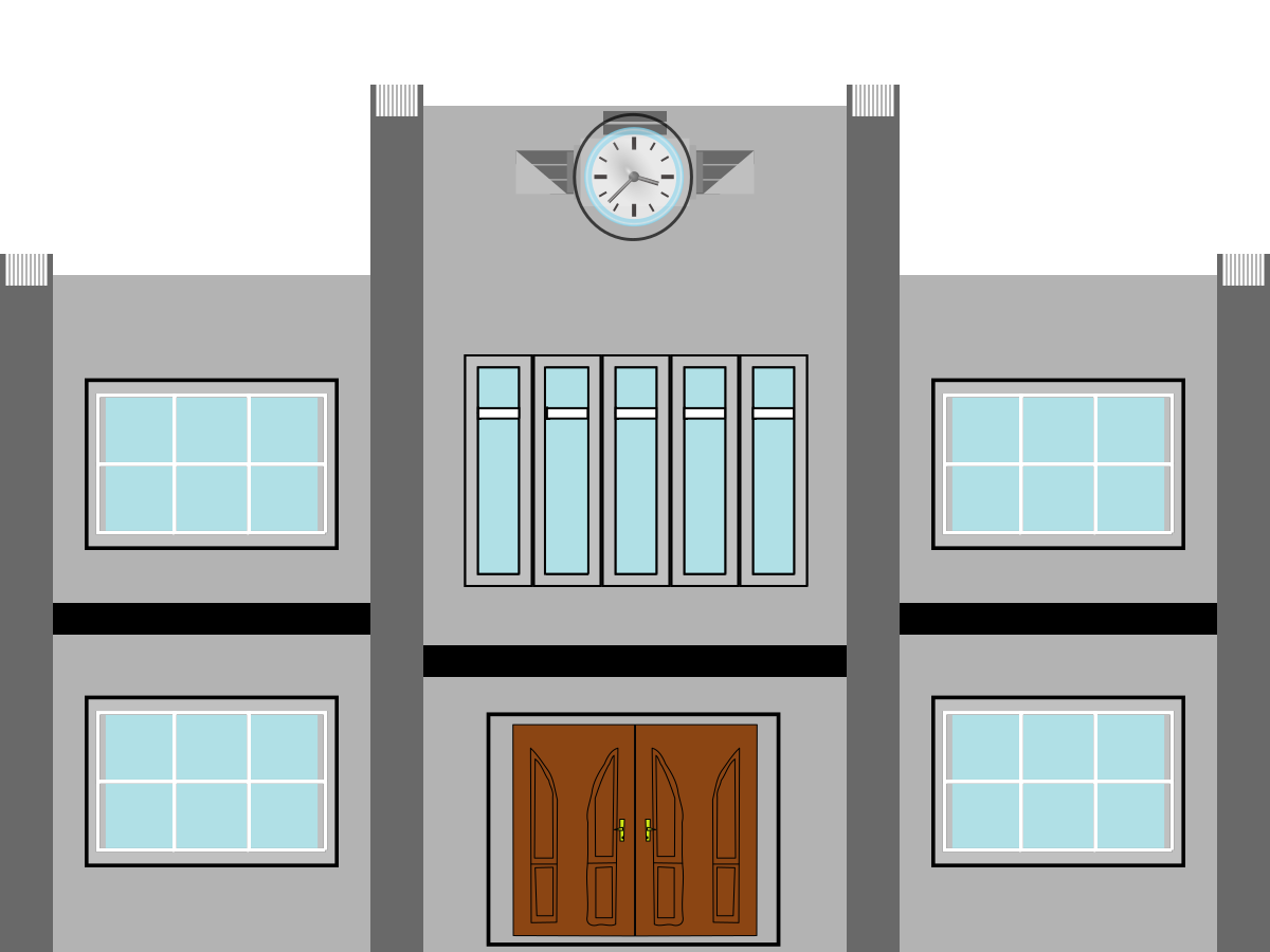 This features a two-story gray building with light blue windows and double brown doors. The building appears to be an old school, as indicated by its architectural style. A clock is prominently displayed on the side of the building, adding a sense of time and history to the scene. The overall atmosphere suggests that this could be a place where students used to gather for learning and socializing.