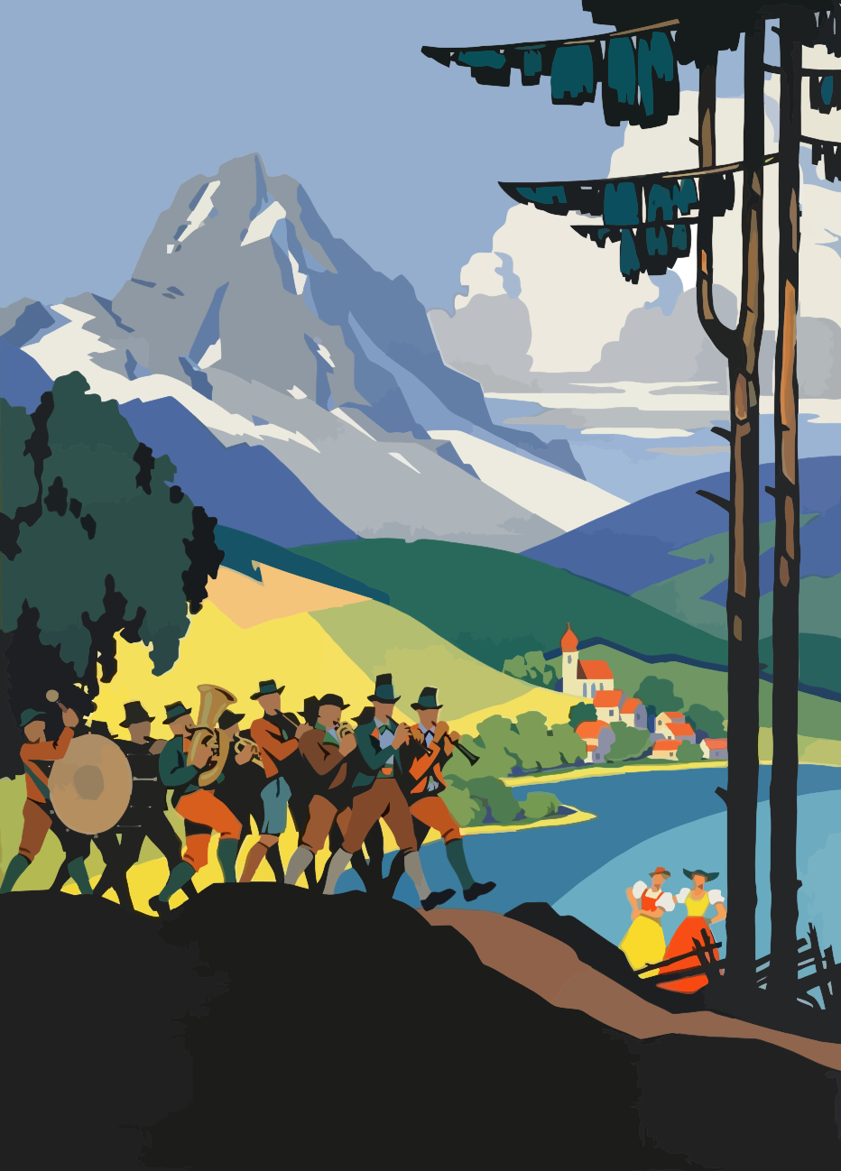 Tags: alps, austria, classic, europe, group, lake, mountain, music, nature, person, poster, scene, semi-realistic, town, travel, village, vintage, landscape, tree, painting, colorful, band, musician, drummer, violinist, skier, snowboarder, alp, forest