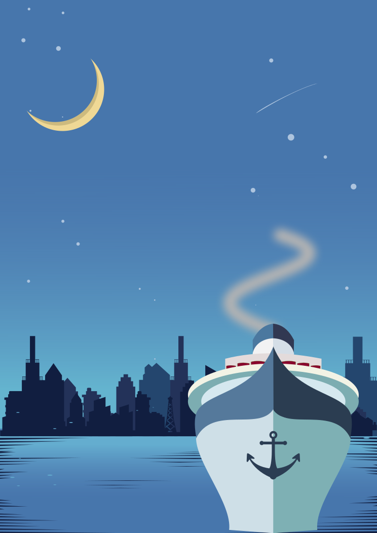 This features a large white and blue boat floating on the water at night. It appears to be a cruise ship, as it is traveling through the ocean under a clear sky with a moon and stars visible in the background. The boat's lights are shining brightly, illuminating its path through the water. In addition to the boat, there are several buildings situated along the shore, creating an interesting contrast between the natural beauty of the ocean and the man-made structures on land.
