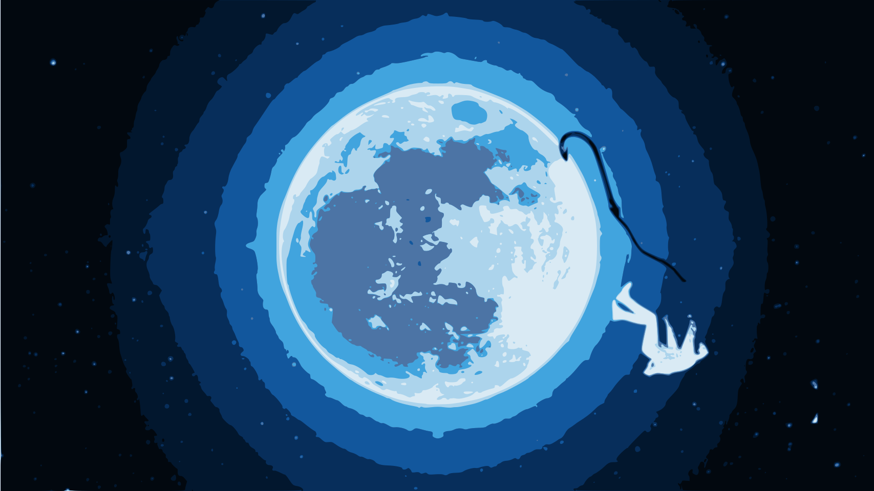 This features a man falling from the moon while climbing it. He is holding onto a rope, which seems to be his only support as he descends. The scene takes place in front of a large blue moon that fills most of the background. The man's position and the moon's size create an interesting visual effect, making it appear as if he is falling from the moon itself.