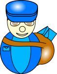 This features a cartoon character of a postman wearing a blue hat and carrying a sack full of letters. The postman is depicted with a smile on his face, giving the impression that he is happy to be delivering mail. The sack appears to be quite heavy, as it is filled with numerous letters, indicating that the postman has been busy with his duties. This whimsical illustration captures the essence of postal workers and their dedication to ensuring timely delivery of mail.