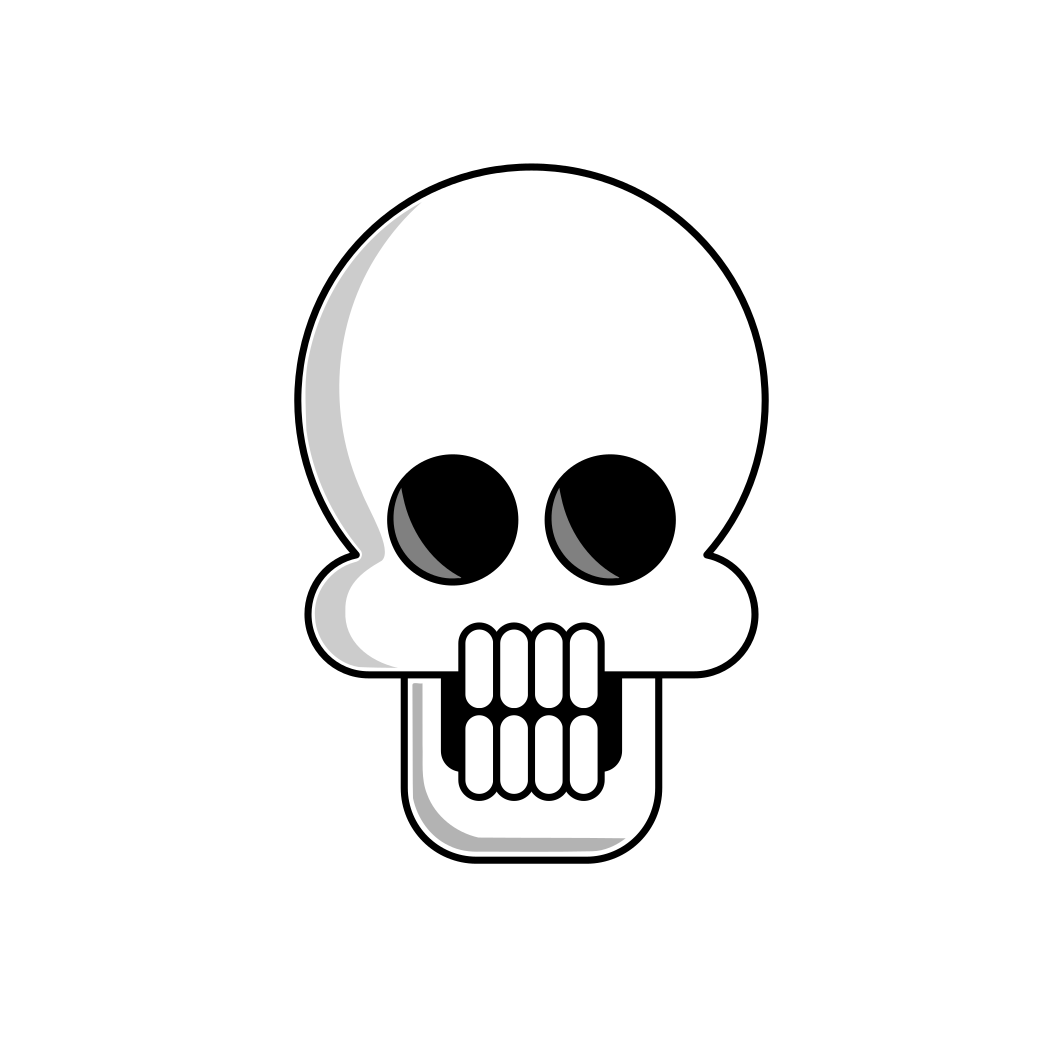 This features a white skull with black eyes and teeth, giving it an ominous appearance. It is depicted in a simple outline style, making it look like a cartoon or a graphic design element. The skull's facial features are clearly visible, including the two large eye sockets and the row of teeth that extend from its lower jaw to its upper jaw. This image could be used for various purposes such as decoration, artwork, or even in a medical context to represent skeletal structures.