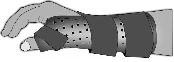 This features a hand with a brace on it, holding a small white ball. The brace is made of leather and has metal studs covering the surface. The hand appears to be wearing a glove or a protective cover over it. The scene takes place in an open area where the person can comfortably hold the ball without any obstructions.