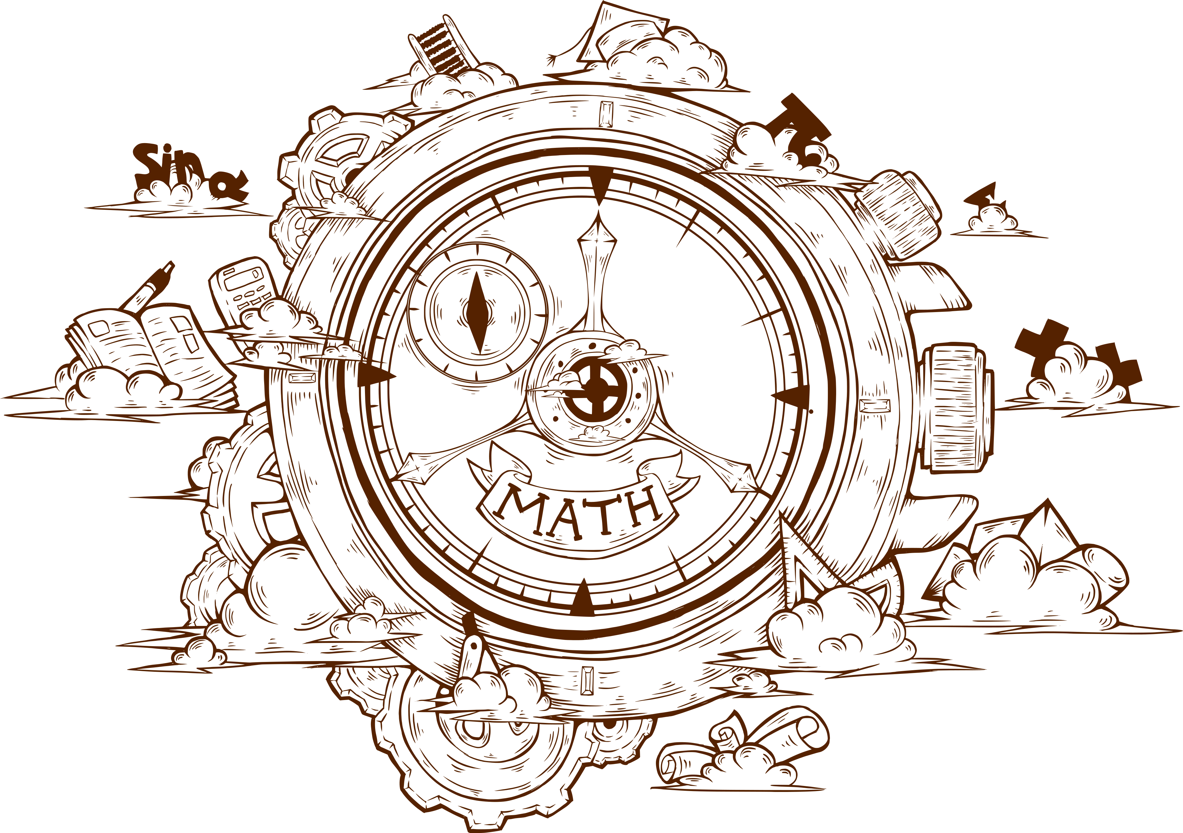 This features a unique clock design that incorporates math symbols and elements. It is shaped like a circle, with gears and clouds surrounding it. There are several math signs scattered throughout the scene, adding to its intricate and creative appearance. In addition to the main clock, there are other objects in the background, such as an airplane and a bird, which further enhance the artistic nature of the image. The combination of these elements creates a visually appealing and imaginative representation of math concepts.