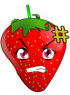This features a cartoon-like strawberry with an angry expression on its face. It has a large, red body and is adorned with green leaves. The strawberry's eyes are open wide, giving it a menacing appearance. In addition to the main character, there is another smaller strawberry located towards the top left corner of the image. The overall scene appears to be a playful and creative representation of a fruit.
